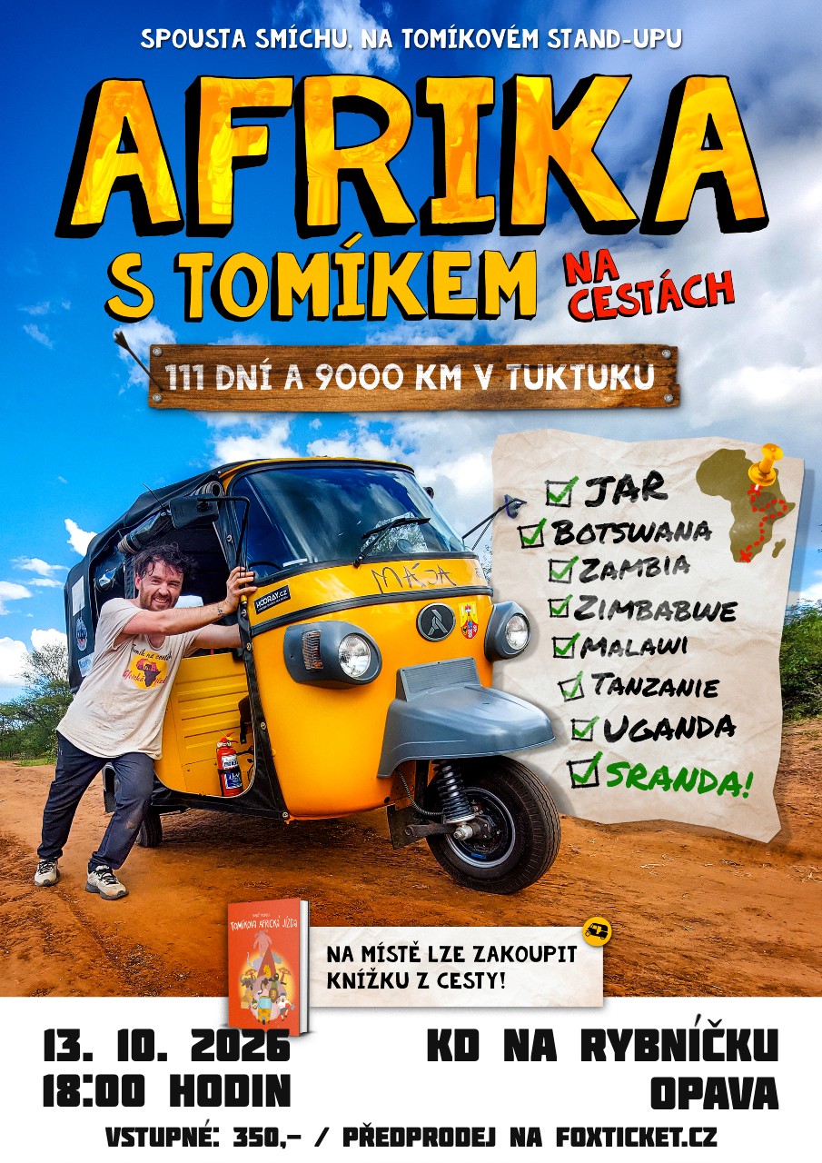 Jak se řídí tuktuk v Africe? Jak žijí dnešní domorodé kmeny? Co vše se tam jí? Co malárie? A kde to bylo nejtěžší? Mnoho barvitých historek doprovázených krásnými, nejen dronovými záběry, vám Tomík s humorem a jistou nadsázkou mile rád poví. Přijďte se zasmát, inspirovat a dozvědět se něco nového o cestování a dalekých afrických zemích.