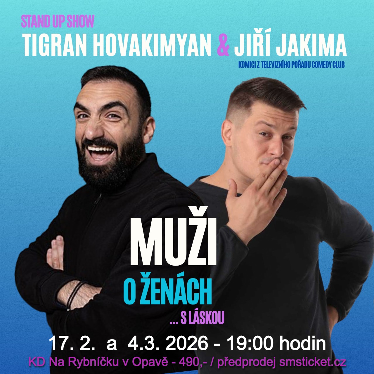 Komici z televizního pořadu "Comedy Club" Tigran Hovakimyan a Jiří Jakima přijíždí do vašeho města, aby bez obalu rozebrali téma muži versus ženy. Chtěli jste vždycky vědět, co si muži myslí o něžném pohlaví, ale báli jste se zeptat? Potom je stand-upová komediální show "Muži o ženách" právě pro vás!